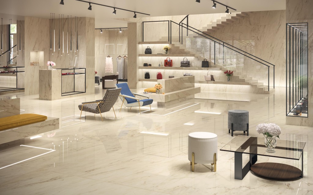 Thanks to its resistance to foot traffic and wear, marble-look porcelain tiles are ideal for shopping malls and stores, creating practical designer environments where you can explore the new dimensions of the customer experience.