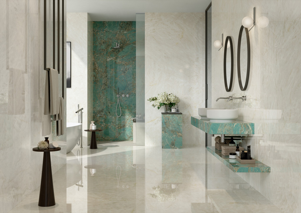 Marble-effect floor and wall surfaces can be used in any style, from contemporary and modern to classic reinterpreted to be timeless. For a warm, welcoming style, beige marble-effect porcelain tiles (Cremo Delicato, Champagne Onyx, Creme Prestige, Beige Mystery, Travertino, Elegant Sable) go well with brown marble-effect porcelain tiles (Bronze Luxury, Absolute Brown)